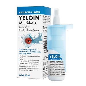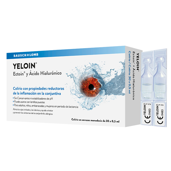 es una solución oftálmica isotónica que reduce eficazmente la irritación, el enrojecimiento, el picor y el lagrimeo; además lubrica la superficie ocular dando lugar a una agradable sensación de alivio. YELOIN® es un colirio, producto sanitario, que contiene Ectoin®, una molécula natural protectora de las células con propiedades reductoras de la inflamación en la conjuntiva y estabilizadoras de las membranas. Además, contiene ácido hialurónico, una molécula natural que calma el ojo por su elevada capacidad de retención de agua y sus propiedades estabilizadoras. Su formulación avanzada posee una muy alta tolerabilidad ya que no contiene conservantes ni estabilizadores del pH.Basándose en los datos disponibles, este producto puede utilizarse en niños, mujeres embarazadas y en mujeres en periodo de lactancia.YELOIN® no contiene conservantes y es compatible con el uso de lentillas y apto para personas con ojos sensibles.